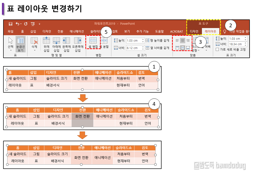 ⑤ [ 표 도구 레이아웃 ]에서 셀 병합을 클릭합니다.